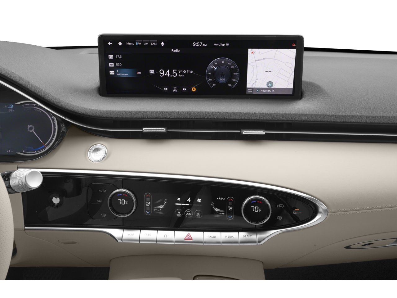 - Radio: Sistema de navegación con pantalla de 14.5 plg y radio AM/FM/HD -incluye: radio SiriusXM con suscripción de prueba de 90 días (no disponible en AK o HI), Genesis Connected Services, Android Auto inalámbrico, Apple CarPlay inalámbrico, sistema Bluetooth de teléfono a manos libres con difusión de audio, sistema de audio premium de 8 altavoces, punto de acceso inalámbrico, amplificador interno y conectividad USB